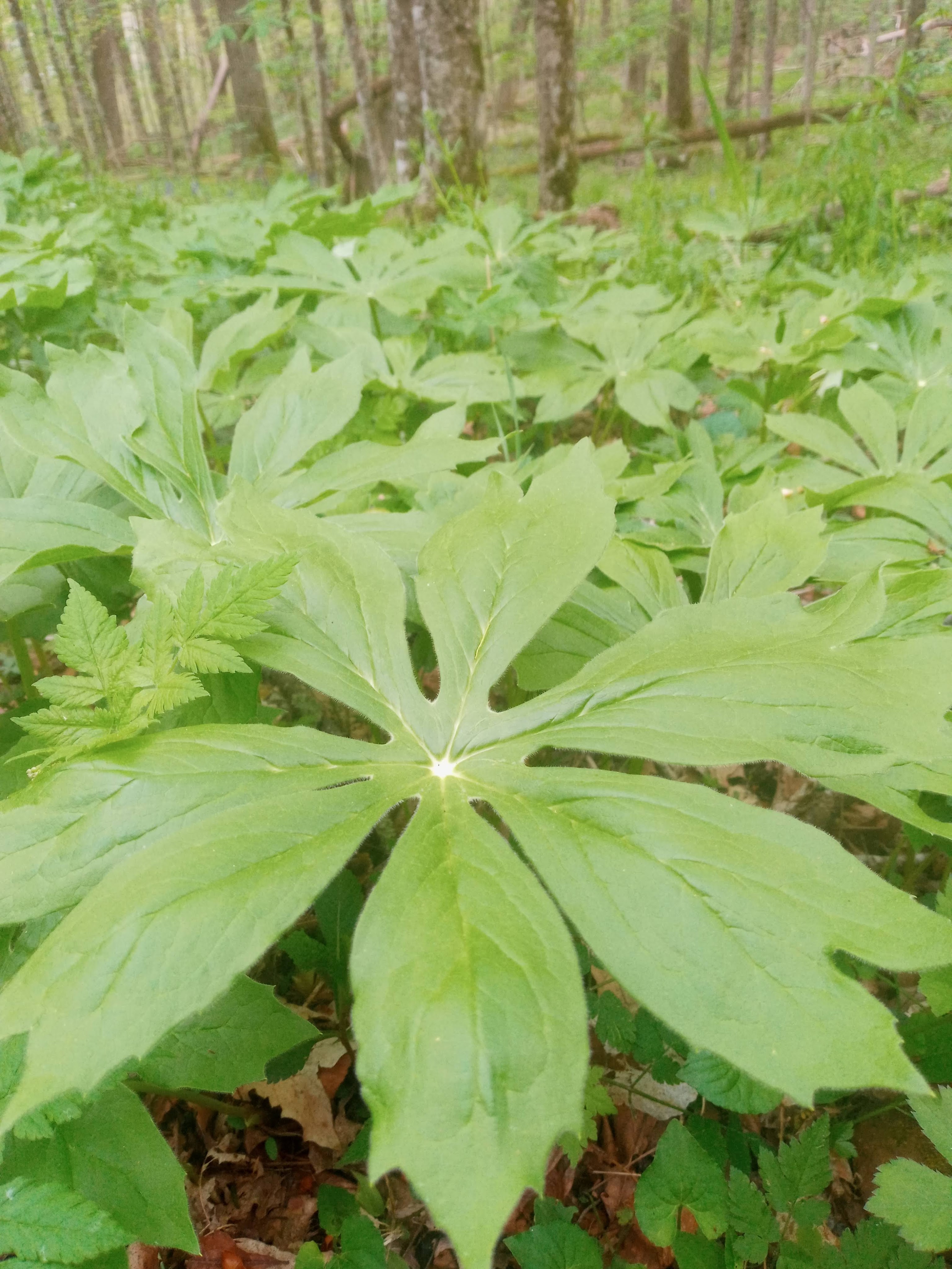 Mayapple, a fruiting plant local to the Appalachian region, typically blooms in May. The Mayapple can be found on the roadsides of Amber Drive near the old Mosley Cabin. Its ripened fruit can be used in jams and marmalades. Be careful, though! The unripe fruit, leaves, and roots of this plant are known to cause vomiting, diarrhea, and even coma.