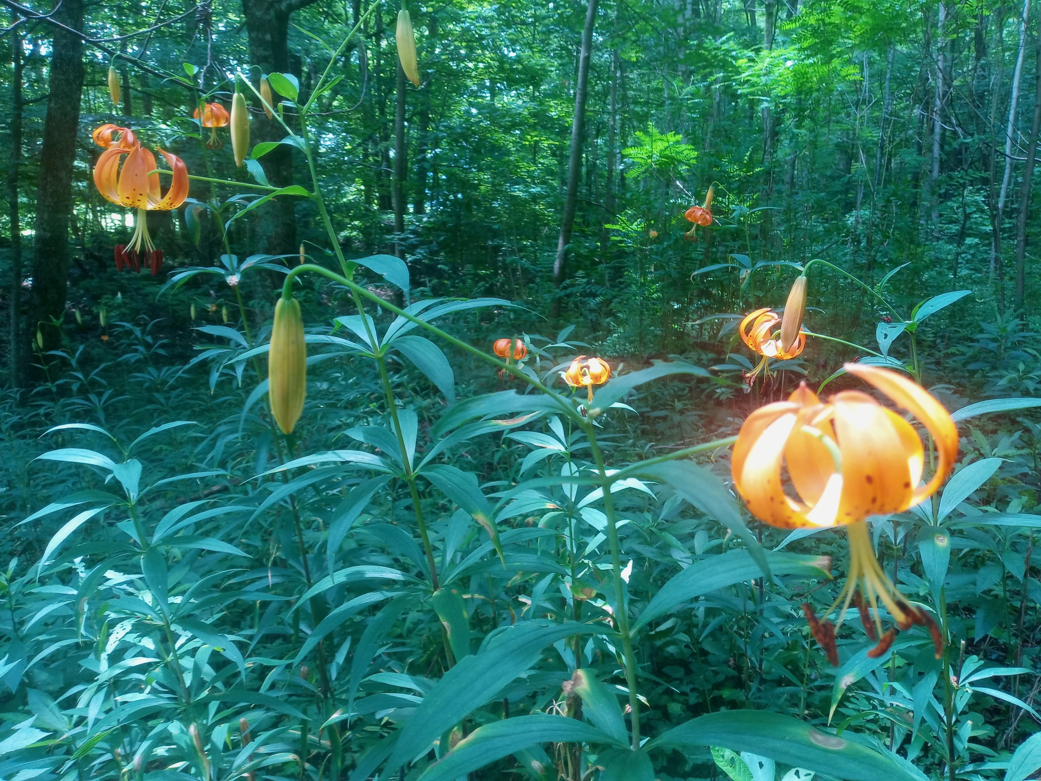Another native roadside attraction is the Turk’s Cap Lily (below). They get their name for their unique flower shape that some say looks a Turk’s cap. Personally, I couldn’t tell you what kind of cap a traditional Turk wears, but that’s what they say this flower resembles. Native Americans made soups out of the bulbs of these plants, but please leave them so that the hummingbirds and butterflies can enjoy them.