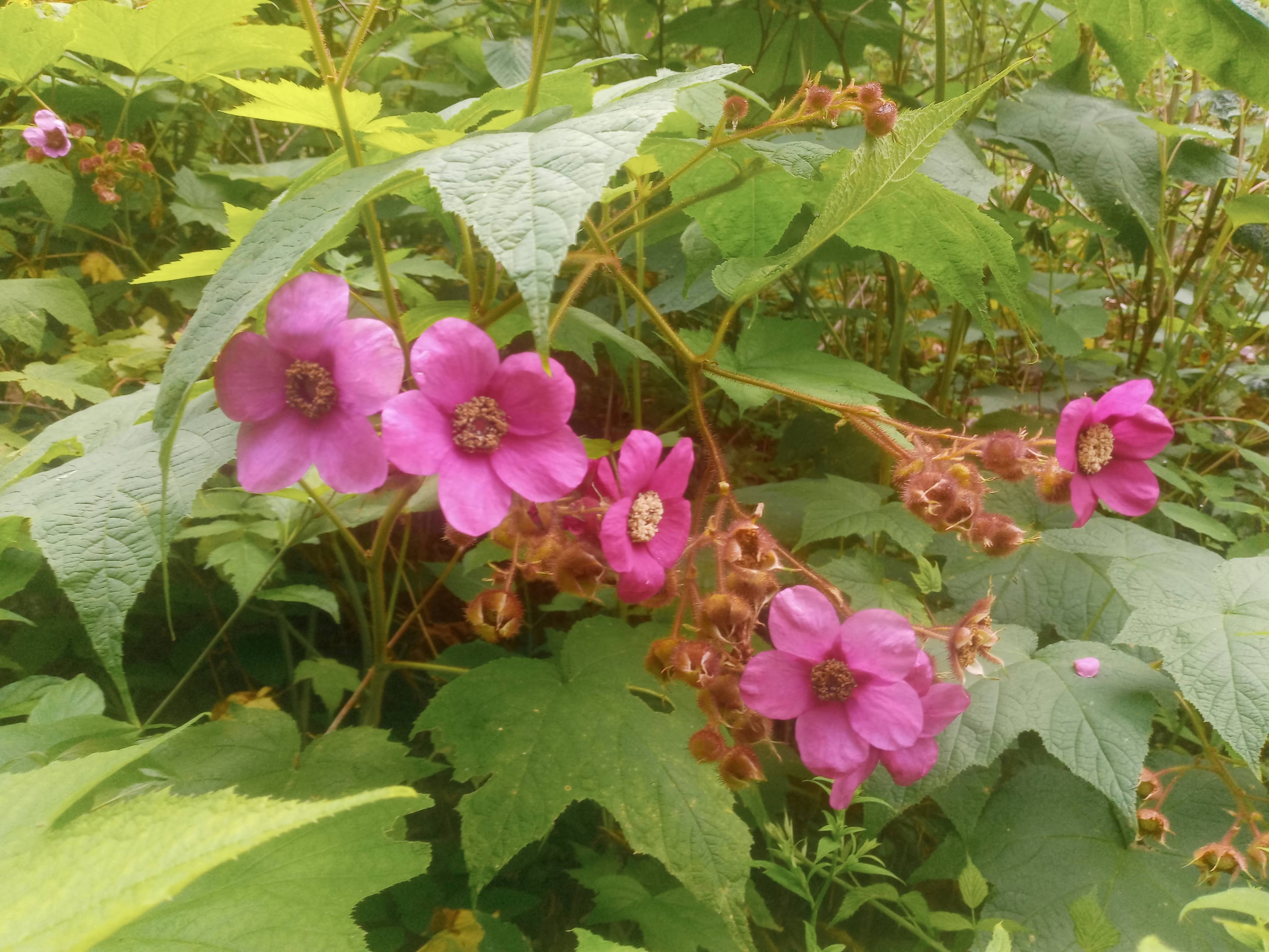 Below is a photo from our roadside of a native raspberry. The berries are pretty tart, but they can be sweetened with sugar to make preserves. This variety doesn’t have any thorns and the leaves resemble that of maple trees. The flowers and berries attract butterflies, bees and birds.